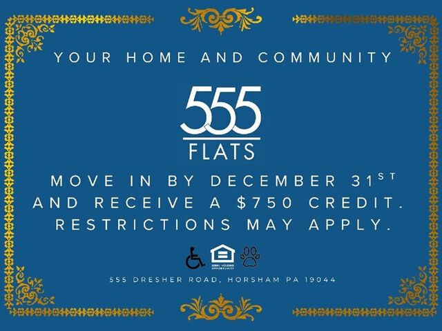 555 Flats is the perfect place to call home. Located in Horsham, PA, our one- and two-bedroom apartments feature top-of-the-line amenities such as wood flooring, in-unit washers and dryers, and a pool for residents to enjoy.