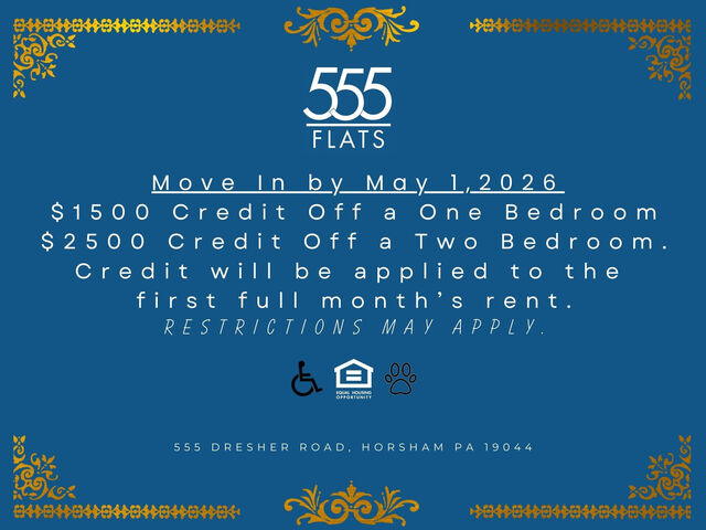 555 Flats is the perfect place to call home. Located in Horsham, PA, our one- and two-bedroom apartments feature top-of-the-line amenities such as wood flooring, in-unit washers and dryers, and a pool for residents to enjoy.